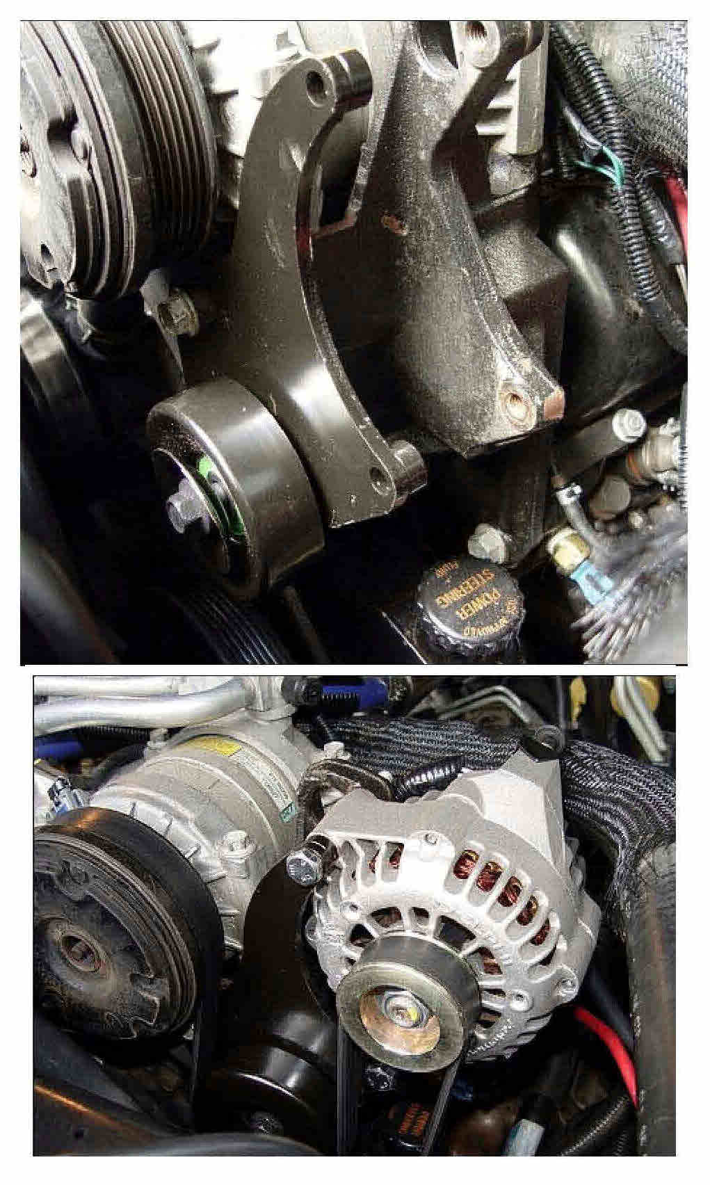 Dual alternator plate for GM V-8 and V-6 engines with this drivers side air conditioner mount serpentine belt. Actual plate picture not shown.  Fits most 1999 to present. V-8 and V6  engines with the drivers side A/C pump mount.  This version is for engines with an integrated Power Steering mount tank with a cap.  Check your engine to see if you have a steel engine lift ring similar as shown in the upper right (rear) of the picture except it will not have the two tapped holes as shown if will have an oval hole in a steel lift ring - and is not cast.  PLATE ONLY -  (the black part in the front of the upper picture) you will need to source the idler pulley and other parts - a bone yard will do fine for the pulley and spare alternator often.  A CS-144 alternator will also fit with the same mounting holes.   GM wiring schematic diagram  and parts list is included - including recommended belt size.  No alternator mount hole spacers welded on - washers instead.